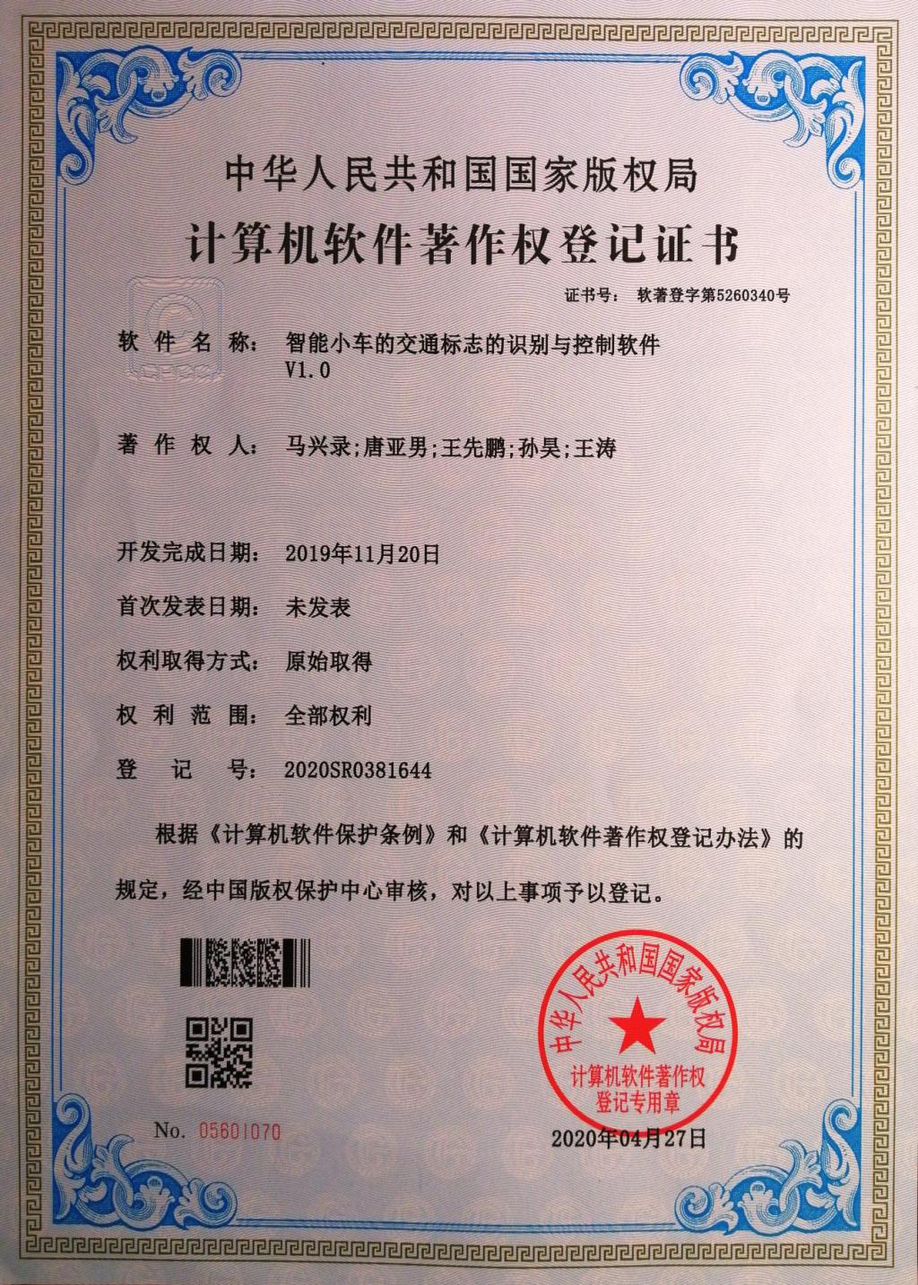 8、软件著作权--智能小车的交通标志的识别与控制软件V1.0
