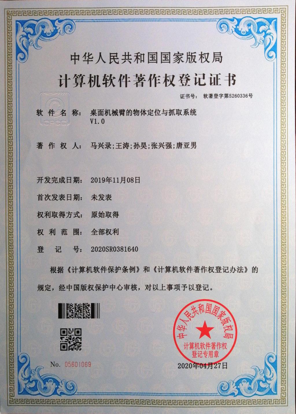 9、软件著作权--桌面机械臂的物体定位与抓取系统V1.0