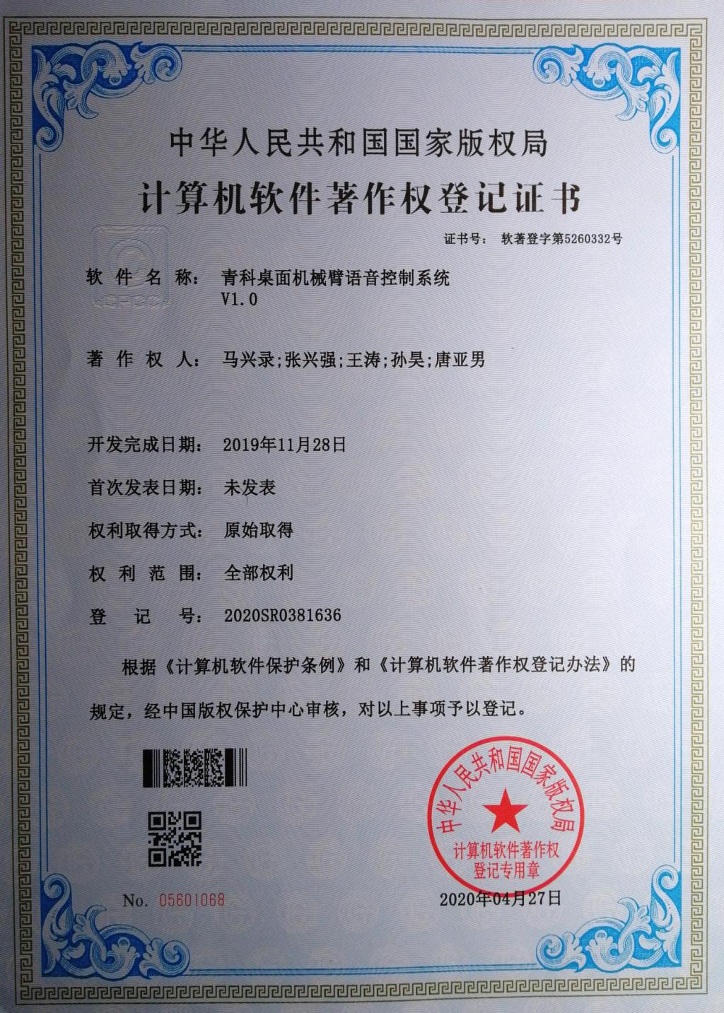 10、软件著作权--青科桌面机械臂语音控制系统V1.0